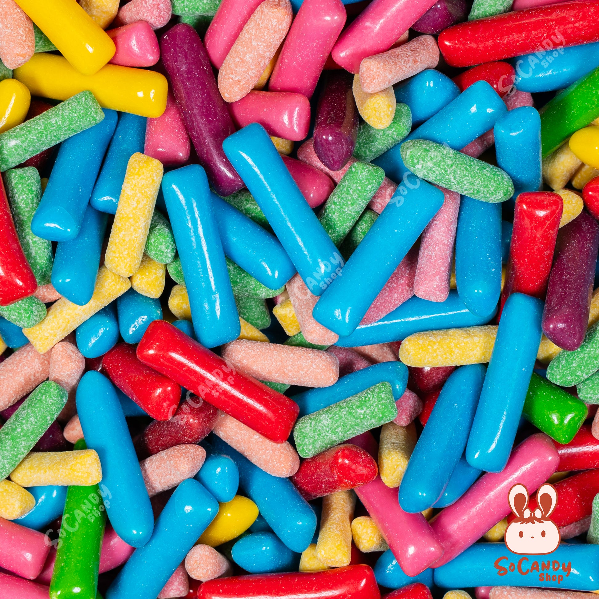 Ingrédients : Sucre, sirop de glucose, dextrose, graisse de palme, 5% jus de fruits concentré (pomme, pêche, citron, fraise, framboise), gélatine (gélatine bovine), stabilisant: gomme arabique, amidon modifié, acidifiants: acide lactique, acide citrique, arômes, émulsifiant: lécithines, colorants: cochenille, curcumine, bleu brillant FCF, charbon végétal médicinal, agents d 'enrobage: cire de carnauba, shellac, cire d 'abeille blanche et jaune.