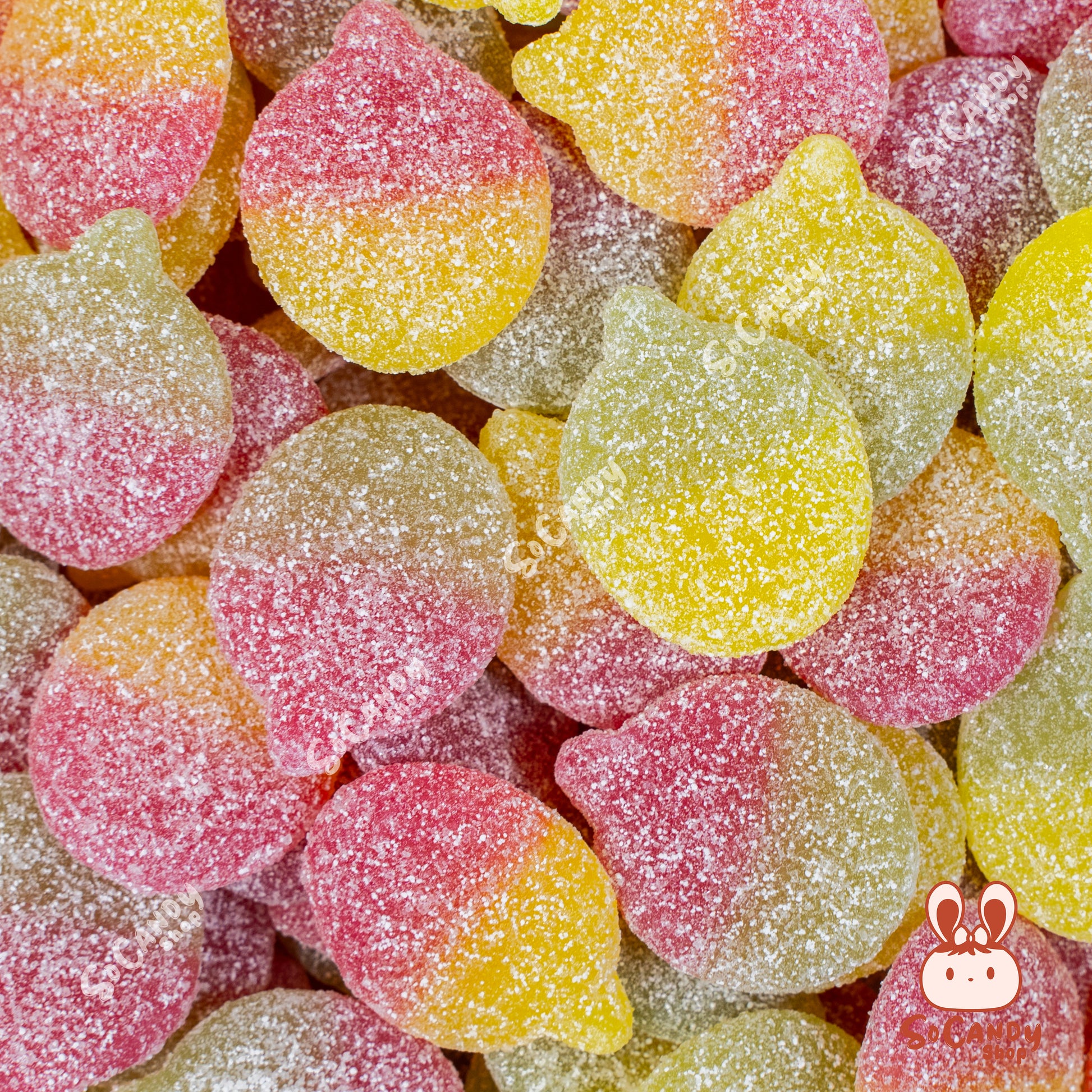 Ingrédients : Sucre, sirop de glucose, amidon de BLÉ, eau, amidon de maïs modifié, acidifiants (E270, E296, E330, E350), amidon de pomme de terre modifié, correcteur d'acidité (E500), concentré de spiruline et de carthame, concentré de jus de carotte noire, colorant (E100)