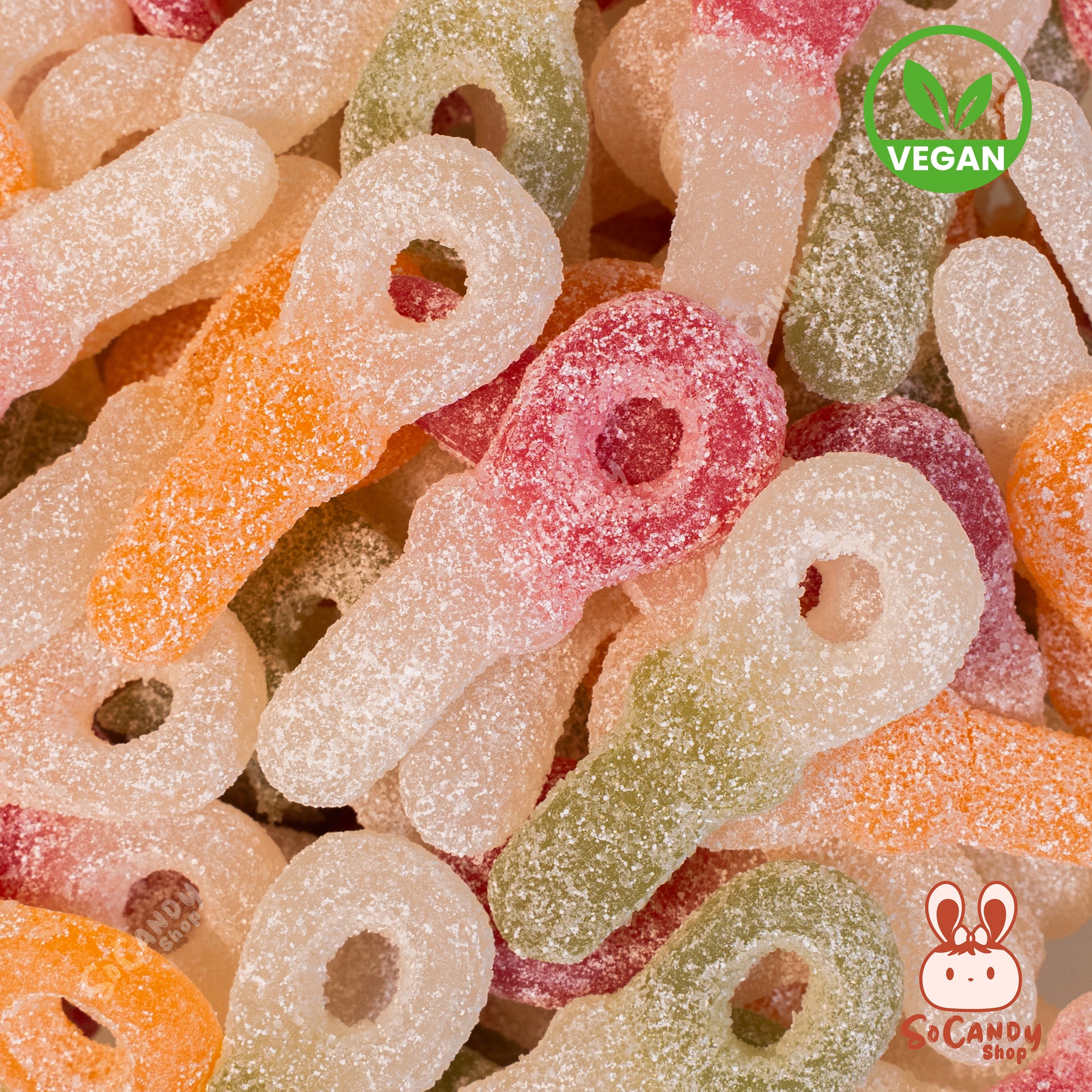 Ingrédients : Sucre ; sirop de glucose ; amidon de BLÉ ; eau ; amidon de maïs modifié ; acidifiants : E270, E296, E330, E350 ; amidon de pomme de terre modifié ; arômes ; colorants alimentaires (concentrés de spiruline, de carthame, de jus de carotte noire) ; colorants: E160c